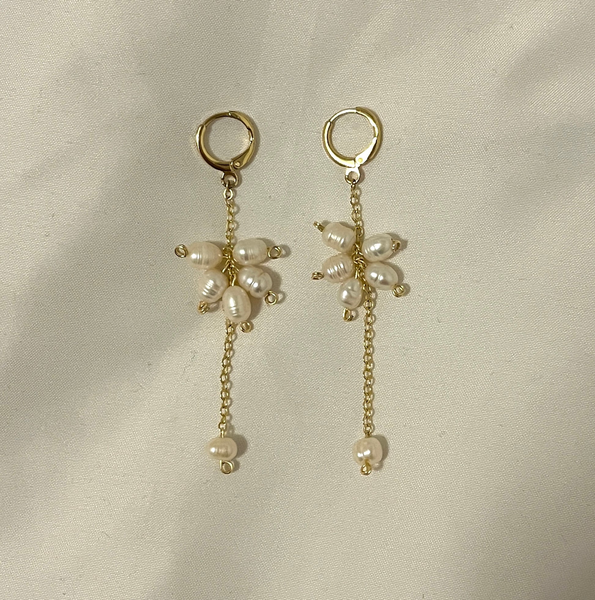 Aretes largos de perlas de río y cadena dorada de acero inoxidable.