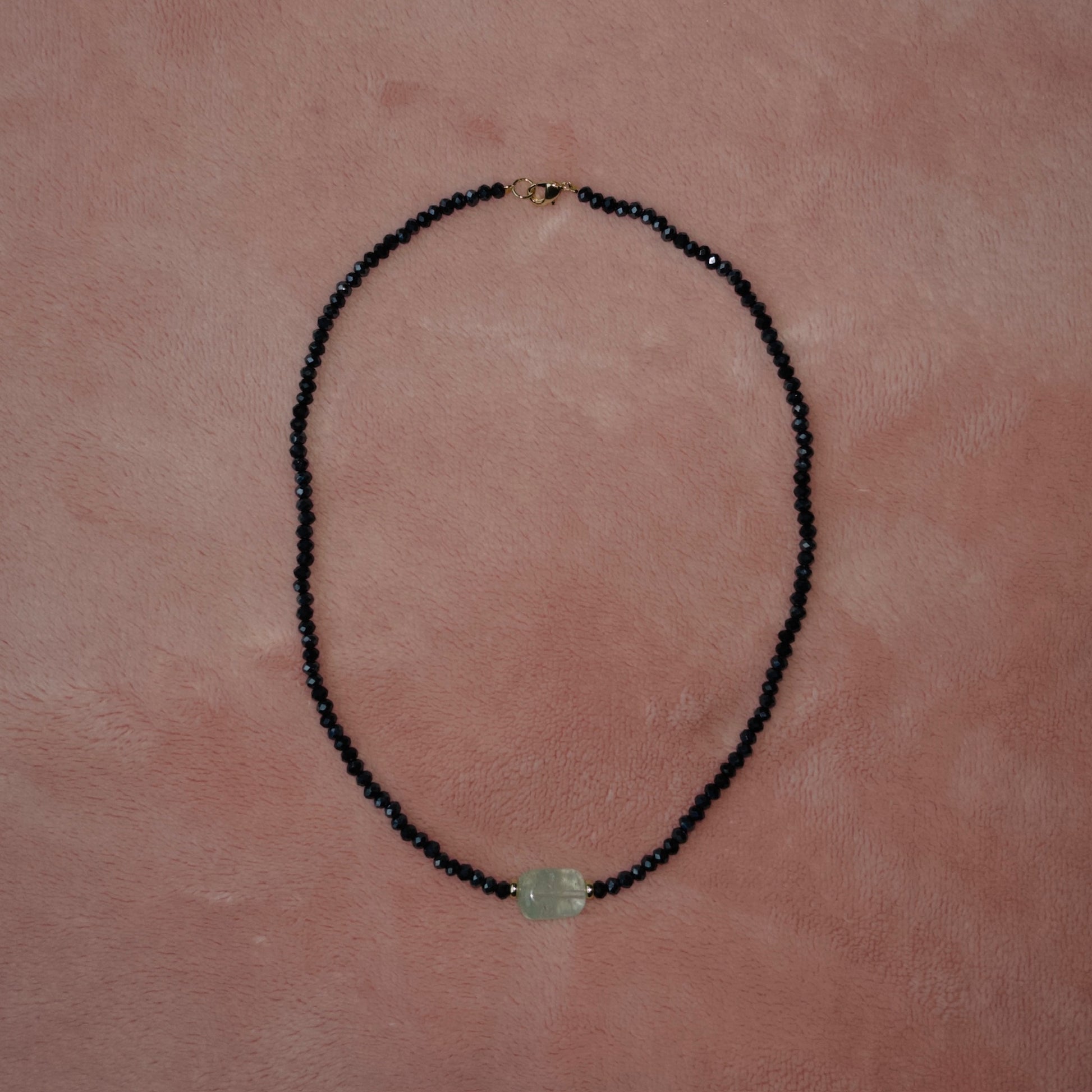 Collar de cristales color griz azulado. Charm de piedra verde traslúcida,