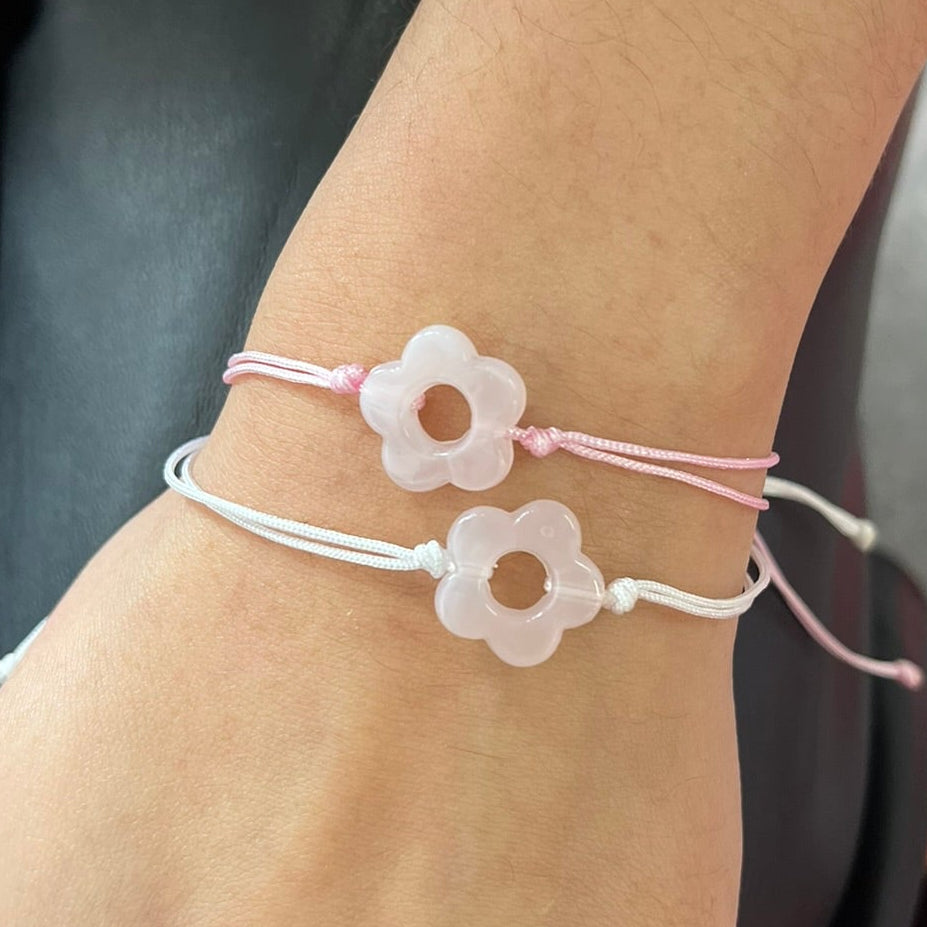 Pulsera ajustable con charm de flor rosada. Hilo en color blanco y rosado.