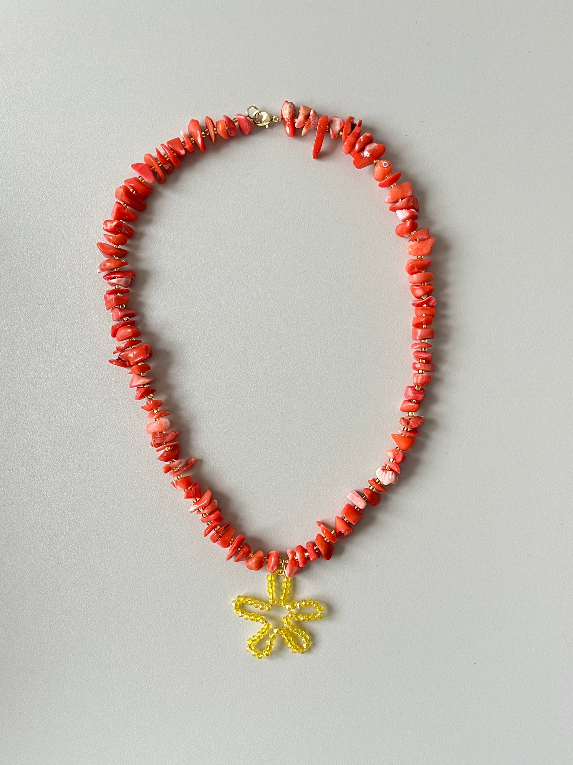 Collar de concha de color naranja con dije de flor hecha de cristales amarillos.