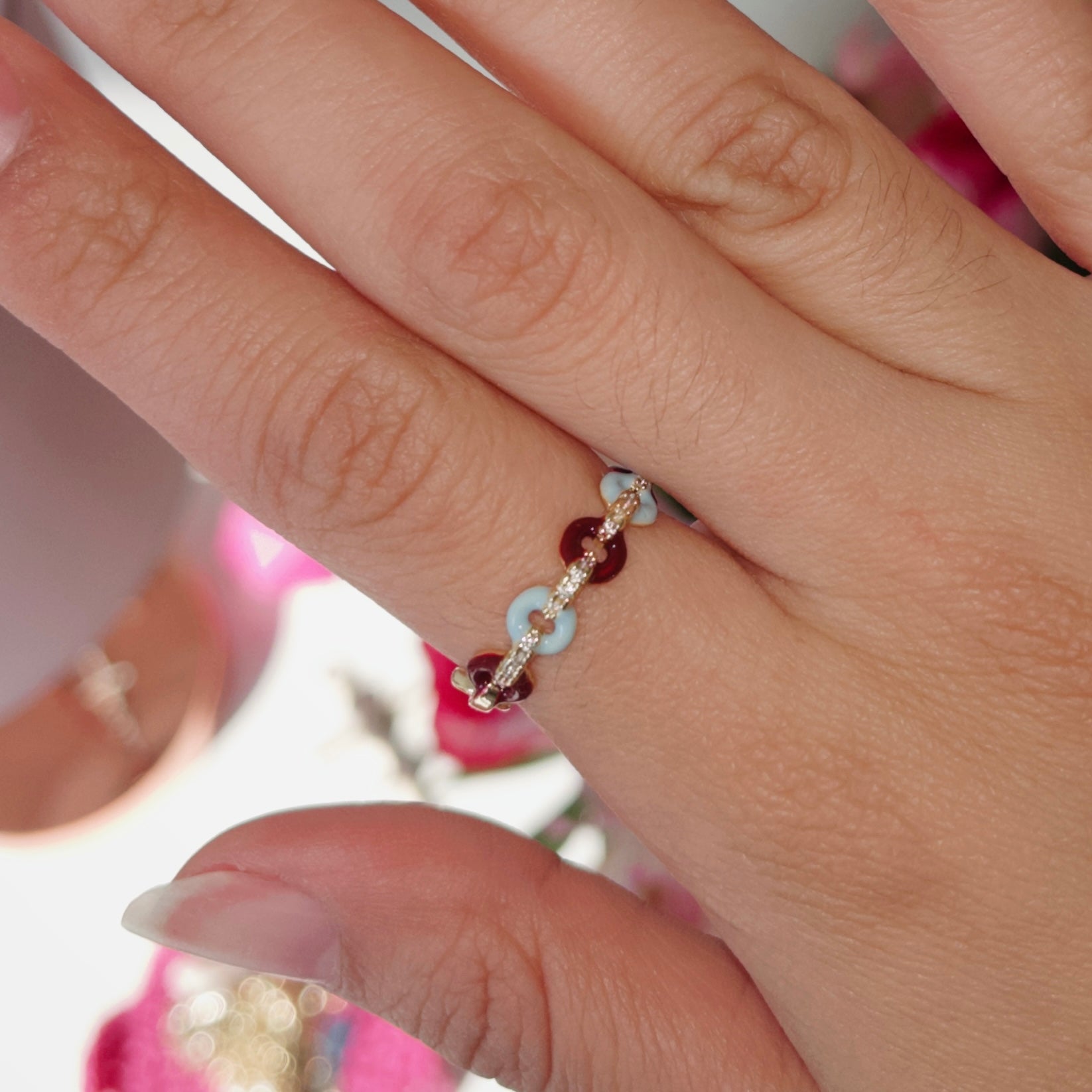 Anillo ajustable dorado con círculos rojos y celestes.